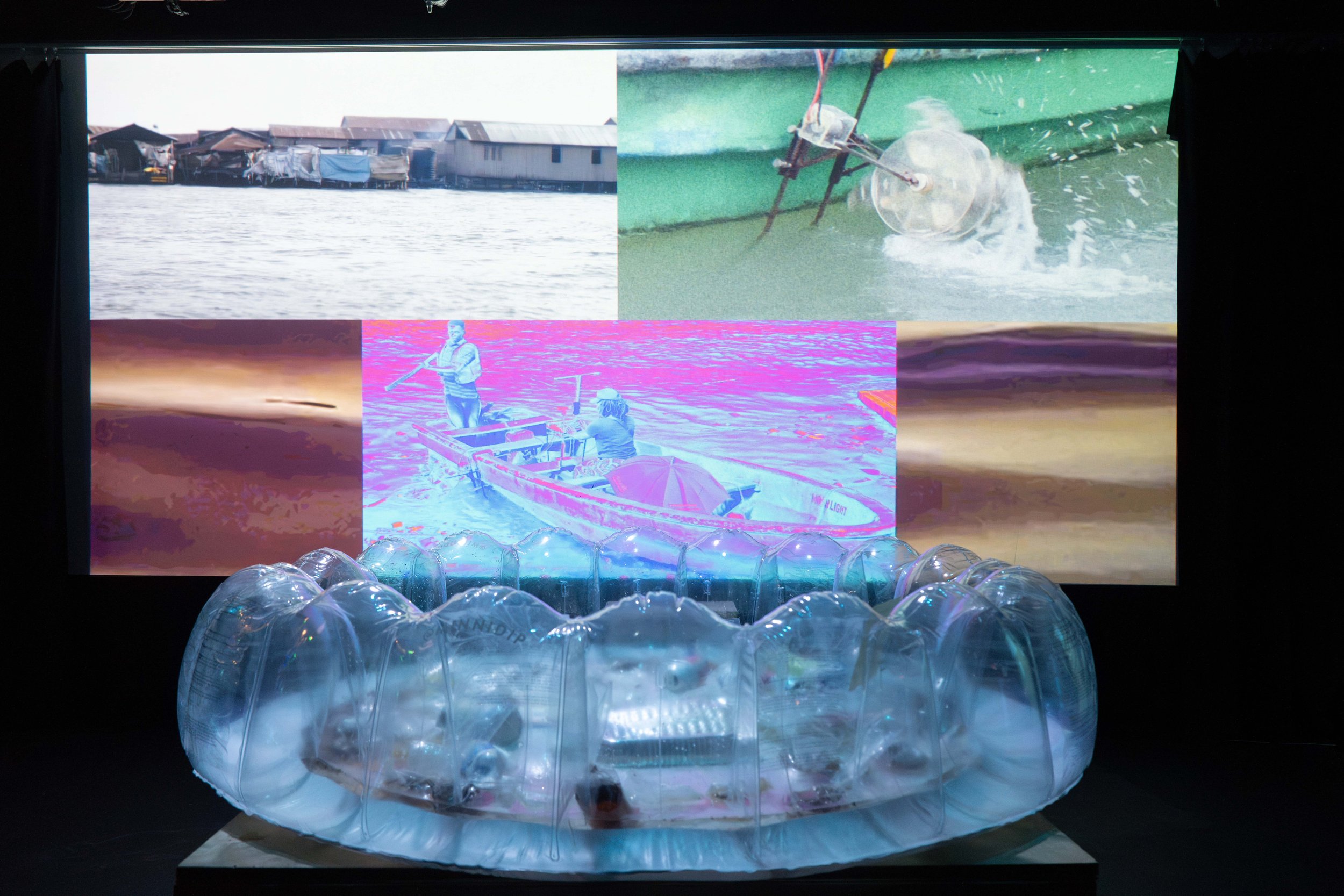 We, unseen viewers, are told we can record an anonymous response, speaking it into existence. Our words will be received in Lagos for Stephanie, who is part of the team on Protest Grammars, to type. Each keystroke will power the wheel, the turning picking up trash in the lagoon. Words as energy, as action. As Stephanie types away, our responses appear overlaid on-screen as stream-like calligrams. Maryam continues: “When I speak, my words do something. But what are they doing?”