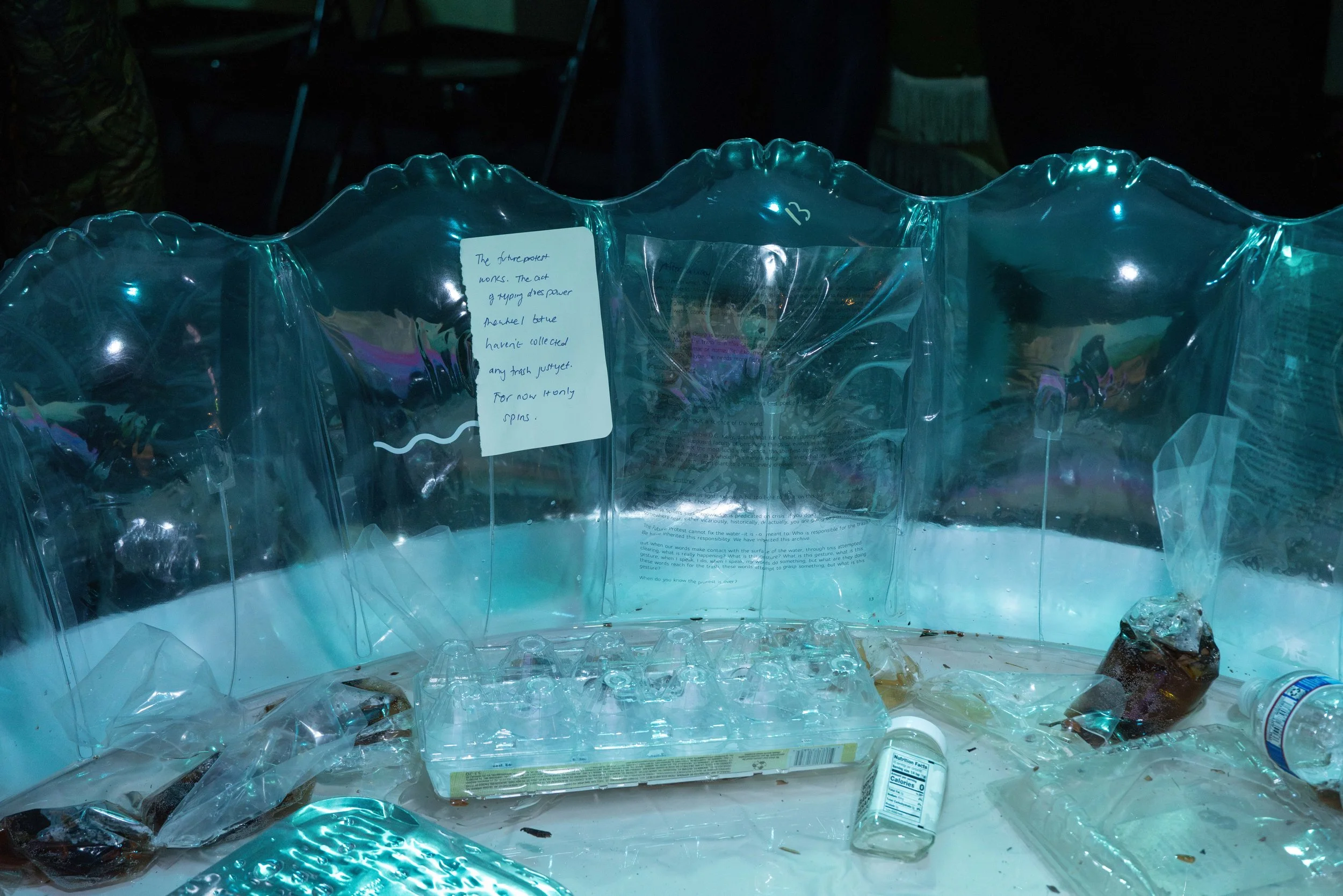 Suddenly, my attention returns to the wheel on the smaller screen. I realize that it isn’t actually collecting any trash. As if sensing my confusion, Maryam explains that this is deliberate. I ask silently: “What is this gesture?” As if hearing me, she responds: “One that puts bodies on water, not to fix but to bring attention to.” This is not about efficiency. Like grammar determines how meeting is made, this is about relation: body meeting water, “how we relate to the Earth, as well as to each other.” This typewriter-meets-wheel powered by words, this Future Protest is a speculative publishing machine.